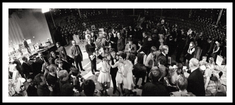 Lokalen är Cirkus i Stockholm på eftermiddagen 1 mars 1969. Den elfte upplagan av Melodifestivalen har just bandats för sändning i Sveriges Television klockan 20 samma kväll. I bildens mitt omfamnas vinnaren Tommy Körberg av Sylvia Vrethammar, Kerstin Dahl och Annica Risberg.